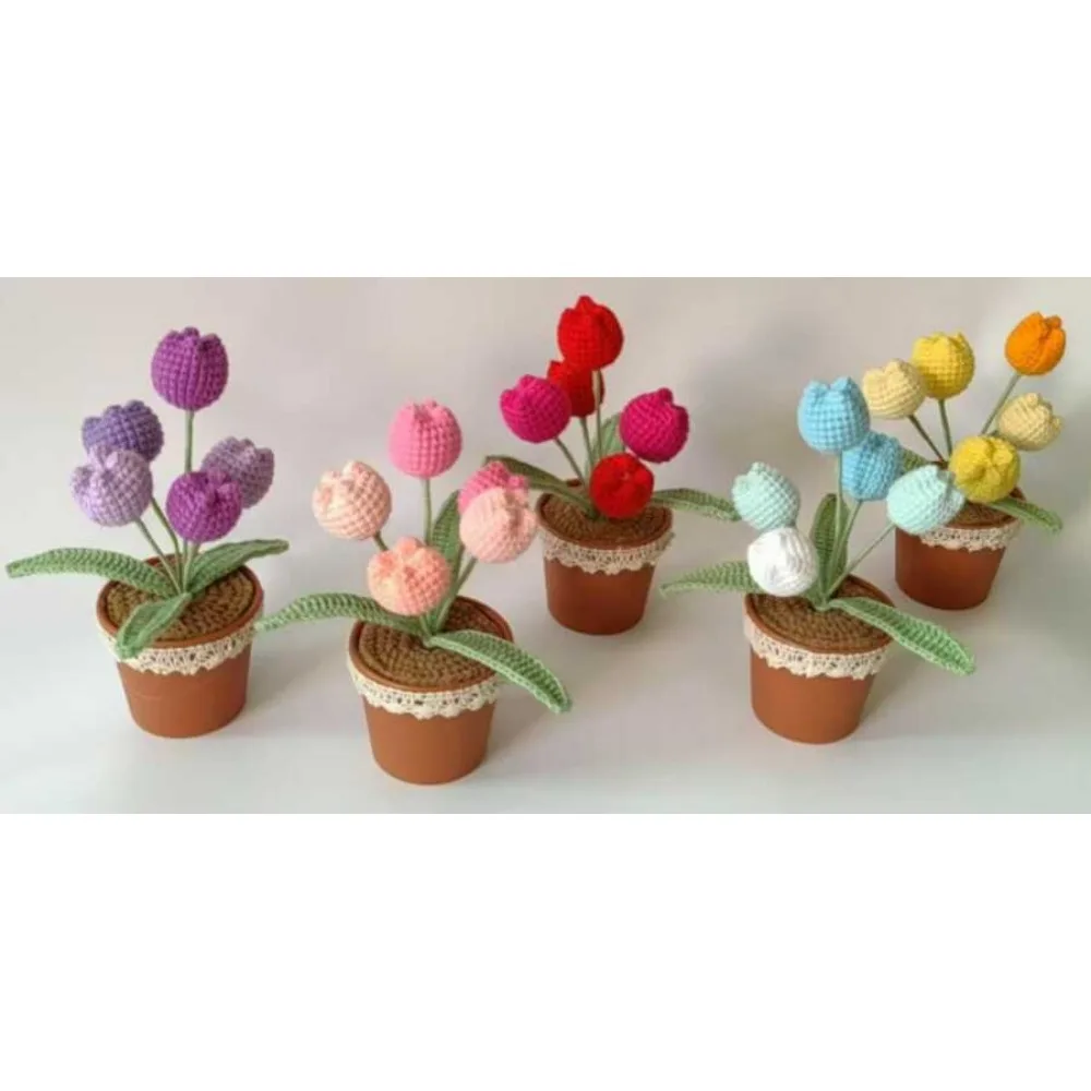 Handmade Crochet Tulip Bouquet Potted Plants, Knitted Artificial Forever Flowers with Exquisite Pot, Gift to Friends Women Kids
